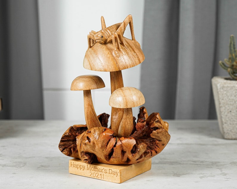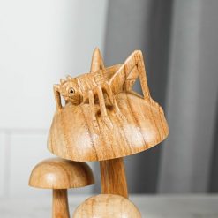 Grasshopper on Mushroom is made from local wood, Jempinis wood. Part of the base of this statue is made of Parasite wood. Parasite wood is a very unique type of wood.